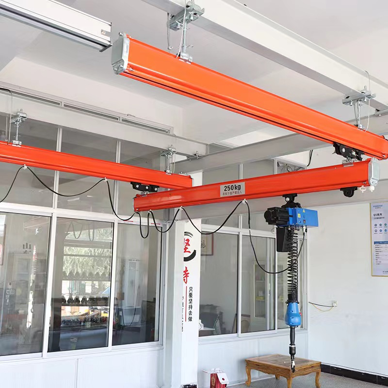 KBK 柔性單梁懸掛起重機由KBK標準組件組成,各標準模塊之間只需用螺栓連接即可使用,可節(jié)省工廠的空間和面積,從而降低能耗,提高企業(yè)效益能使您快速可靠地實現(xiàn)特定區(qū)域內(nèi)的物料輸送以及各種部件的精*定位,系統(tǒng)可以手動操作,也可以實現(xiàn)自動、半自動操作,運行高*??梢院唵蔚貞覓煊诮ㄖ蓓敾蛏喜拷Y構上,起重機軌道無需額外的輔助支撐,無論是服務于車間的部分或者全部,都可以簡單可靠地安裝,成本較低。自立起重機可以完成艱巨的高架起重任務,可以承擔頻繁的高架物料輸送工作;可安裝在普通15cm厚的鋼筋混凝土地面上,不會給建筑物的屋頂結構施加壓力,使用預制標準的模組化設計結構,可輕松地隨著工作單元中心的擴展而擴展。