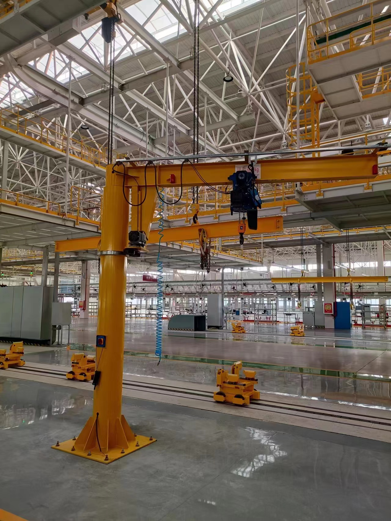 定柱式旋臂起重機配合了可靠性高的JPKK型環(huán)鏈電動葫蘆尤其適用于短距離,使用頻繁,密集性吊運作業(yè),具有、節(jié)能、省事、占地面積小,易于操作與維修等特點。環(huán)鏈電動葫蘆有起升和在橫梁上往返運行的功能,旋臂梁可由回轉(zhuǎn)裝置上的的減速機帶動滾輪進(jìn)行回轉(zhuǎn)運動,電器控制箱安裝在環(huán)鏈葫蘆上。