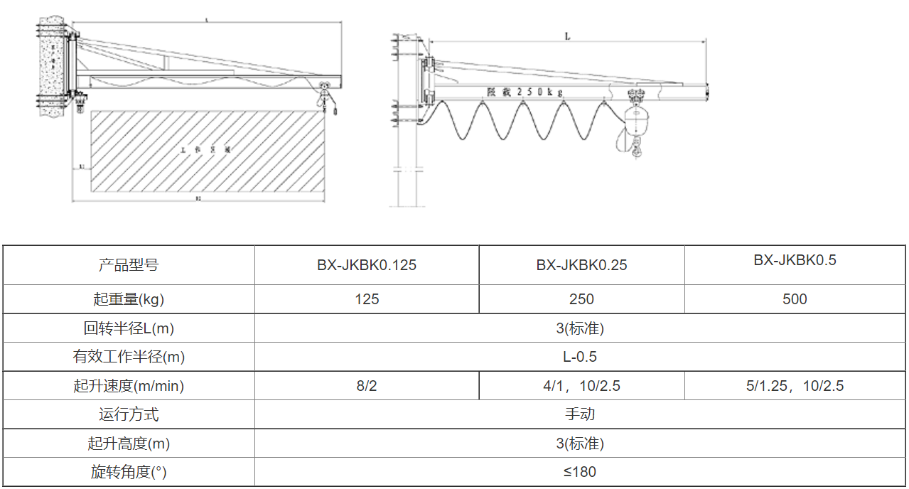 墻壁式旋臂起重機(jī)(又稱 壁柱式旋臂起重機(jī) 壁柱式旋臂吊 壁柱式旋臂吊 墻壁吊 墻壁式旋臂起重機(jī)) 墻壁吊是由支架、旋臂裝置及環(huán)鏈電動(dòng)葫蘆等組成。旋臂固定在墻壁或水泥柱上,可根據(jù)用戶需求進(jìn)行回轉(zhuǎn)?;剞D(zhuǎn)部分分為手動(dòng)回轉(zhuǎn)和電動(dòng)回轉(zhuǎn)。環(huán)鏈電動(dòng)葫蘆安裝在旋臂軌道上,用于起吊重物。